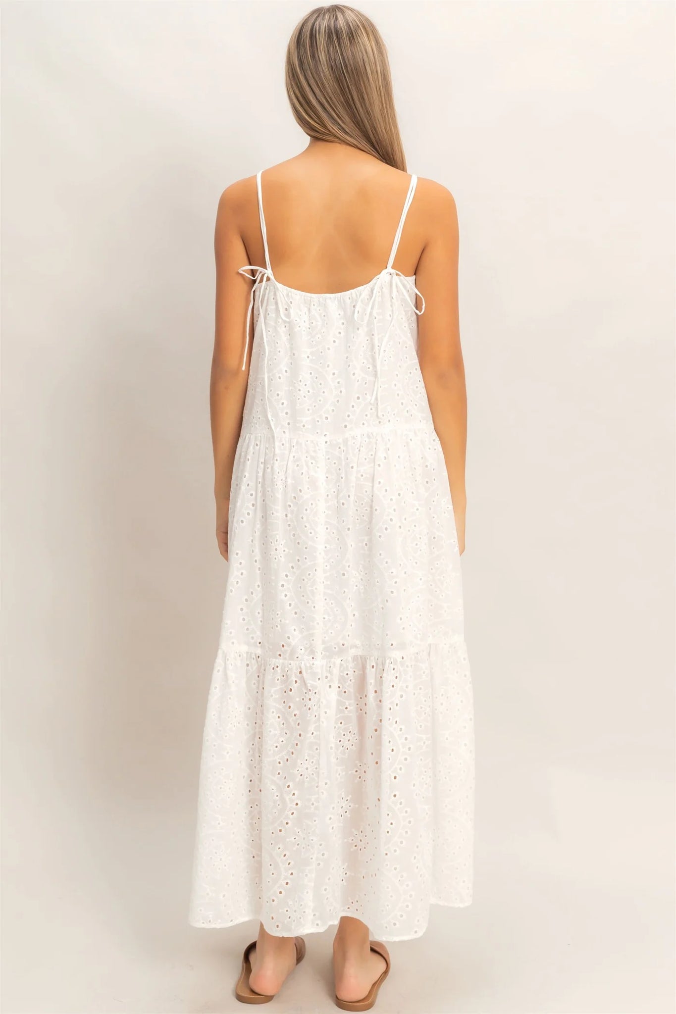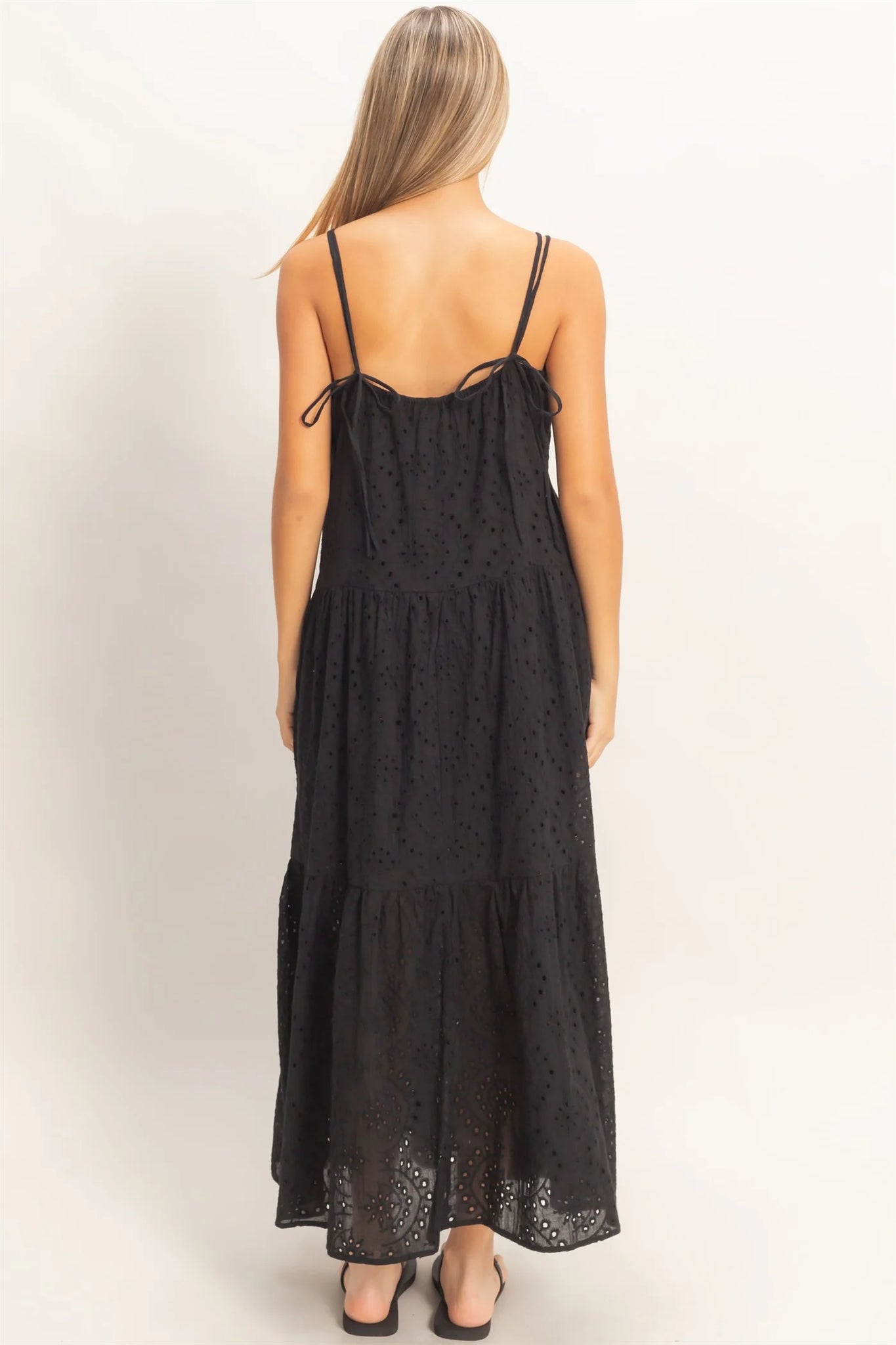 The Eyelet Maxi Dress features a tiered design with a breathable eyelet fabric, providing both comfort and style. Its adjustable spaghetti straps allow for a customizable fit, while the lining ensures modesty and ease of movement. This dress is ideal for warm weather.