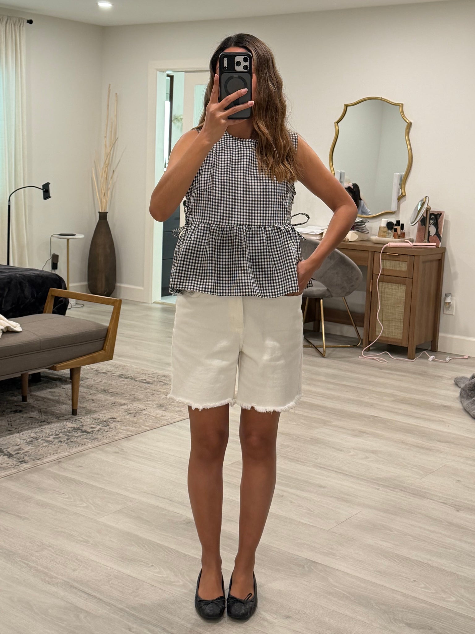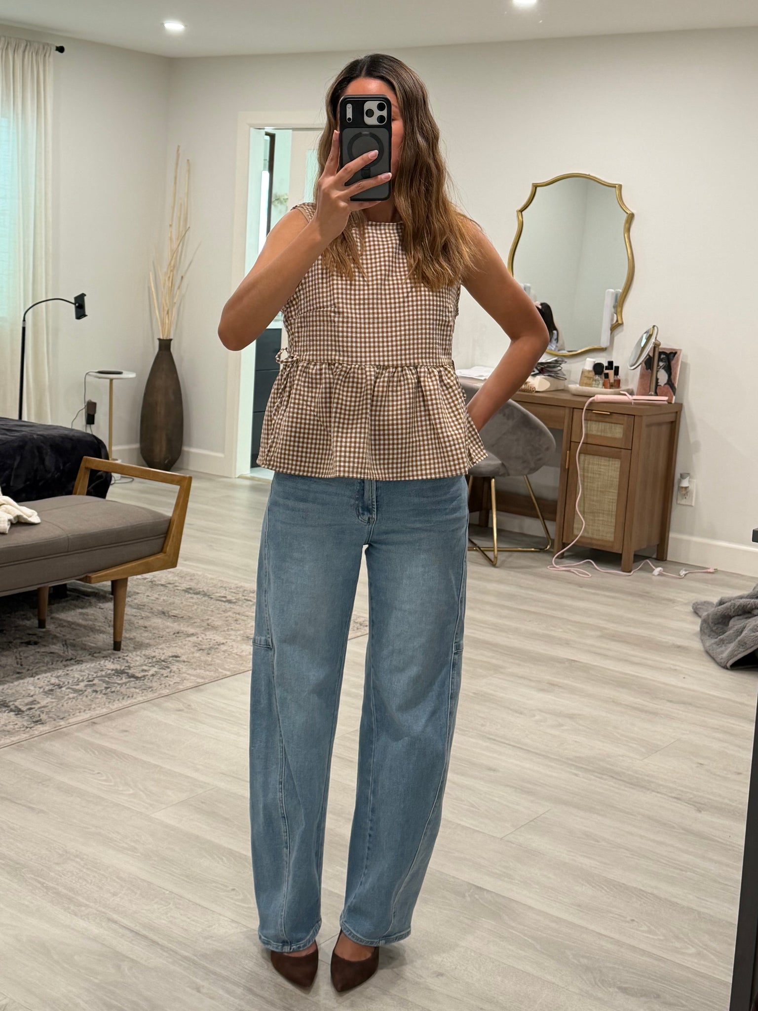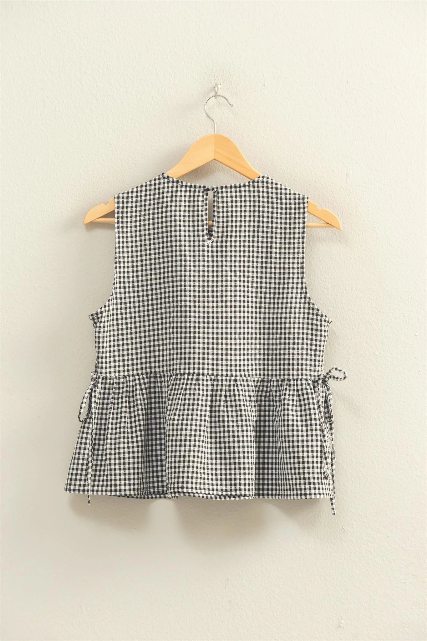 Charming gingham peplum top featuring a flattering ruched silhouette at the waist. Adjustable side ties let you customize the fit while a hidden button closure at the back keeps everything secure. Perfect for adding a playful, feminine touch to any outfit—dress it up with skirts or down with denim for effortless versatility.