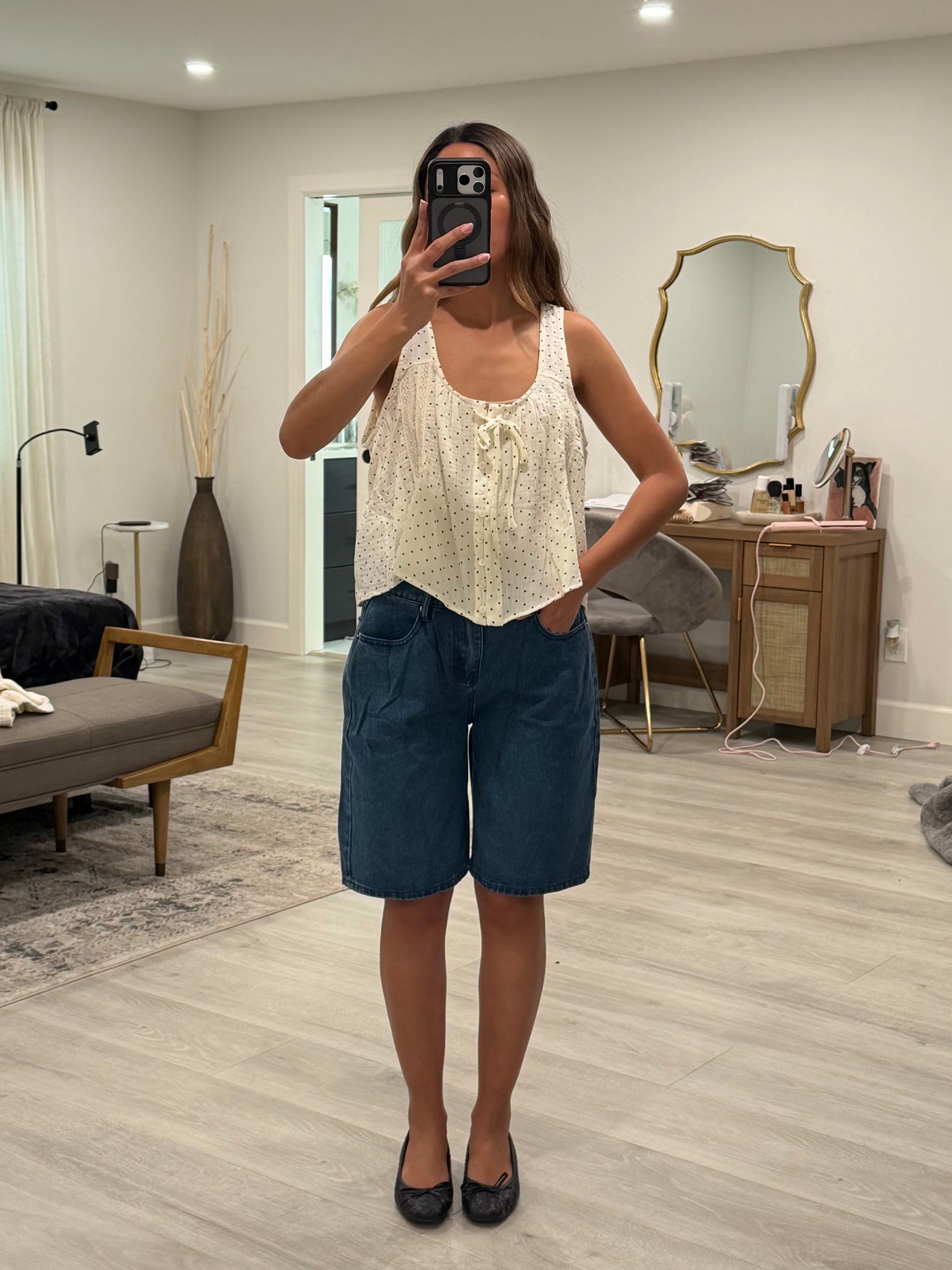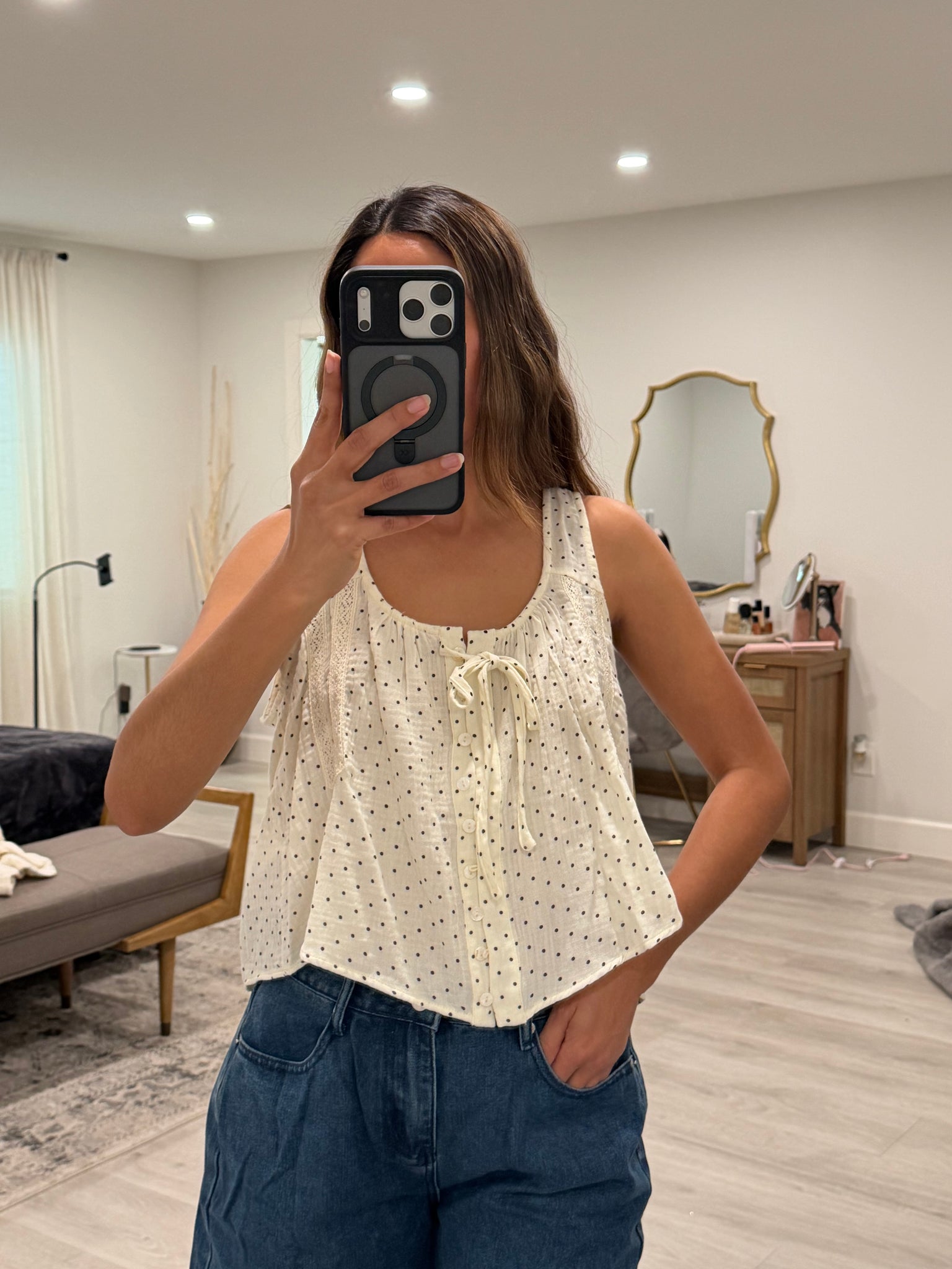 Effortless style meets playful charm in this polka dot button-down tank. Delicate lace detailing adds feminine elegance while the flowy silhouette ensures comfortable, breathable wear all day long. Perfect for layering or wearing solo, this versatile piece transitions seamlessly from casual outings to relaxed weekend gatherings. The classic polka dot pattern pairs beautifully with any wardrobe staple.